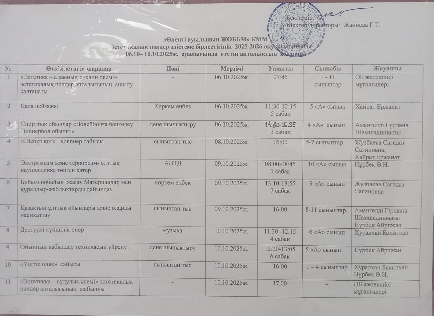 Мектебімізде 6 қазанынан бастап «Эстетика -адамның рухани байлығы» атты Эстетикалық цикл мұғалімдерінің апталығы басталды. Жоспар бойынша ашық сабақтар, сыныптан тыс іс шаралар өткізілуде