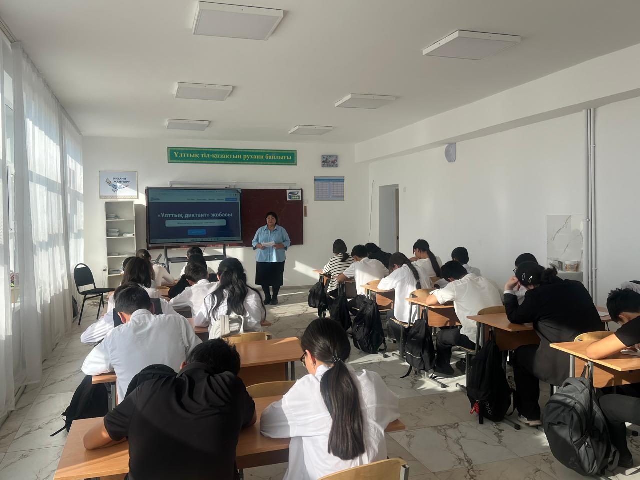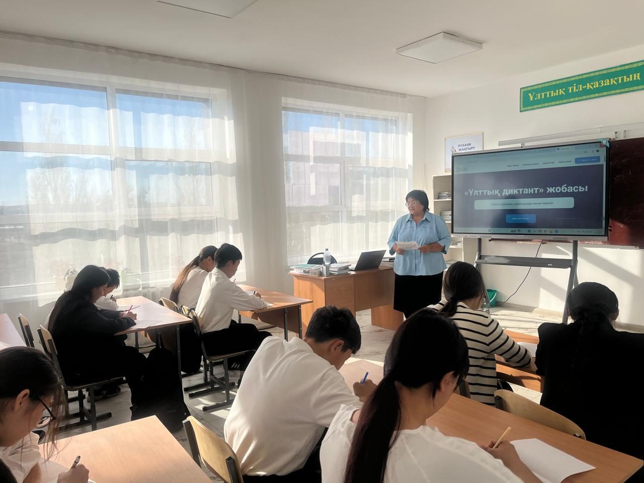 Мектебімізде 2025 жылдың 17 қазан күні мектебіміздің оқушылар мен ұстаздары, Халықаралық қазақ тілі қоғамы және Тіл қазына орталығы бірлесе қолға алған ерекше «Ұлттық диктант» бастамасы жобасына қатысып диктант жазыды. Бұл іс-шара қазақ тілінде дұрыс, сауатты жазуға дағдылану, орфографиялық, пунктуациялық және грамматикалық білімді дамыту, қателесуден қорықпай, ойыңызды еркін жеткізуге үйрену үшін жасалған бастама. Диктантқа қатысушылар саны – 60 адам. Мектеп мұғалімдері (онлайн түрде) – 20 адам. Онлайн қатысушылар https://dictant.til.kz/ платформасы арқылы тапсырма орындап, Алғыс хаттармен марапатталды. «Ұлттық диктант» жазу барысында мектеп оқушылары мен мұғалімдер тілдік бірегейліктің маңызын түсініп, азаматтық жауапкершілікті қалыптастырды.