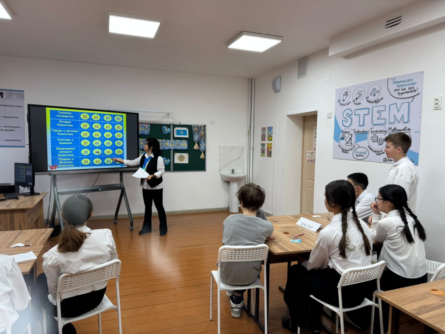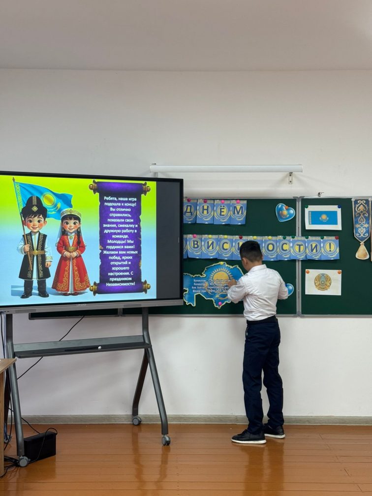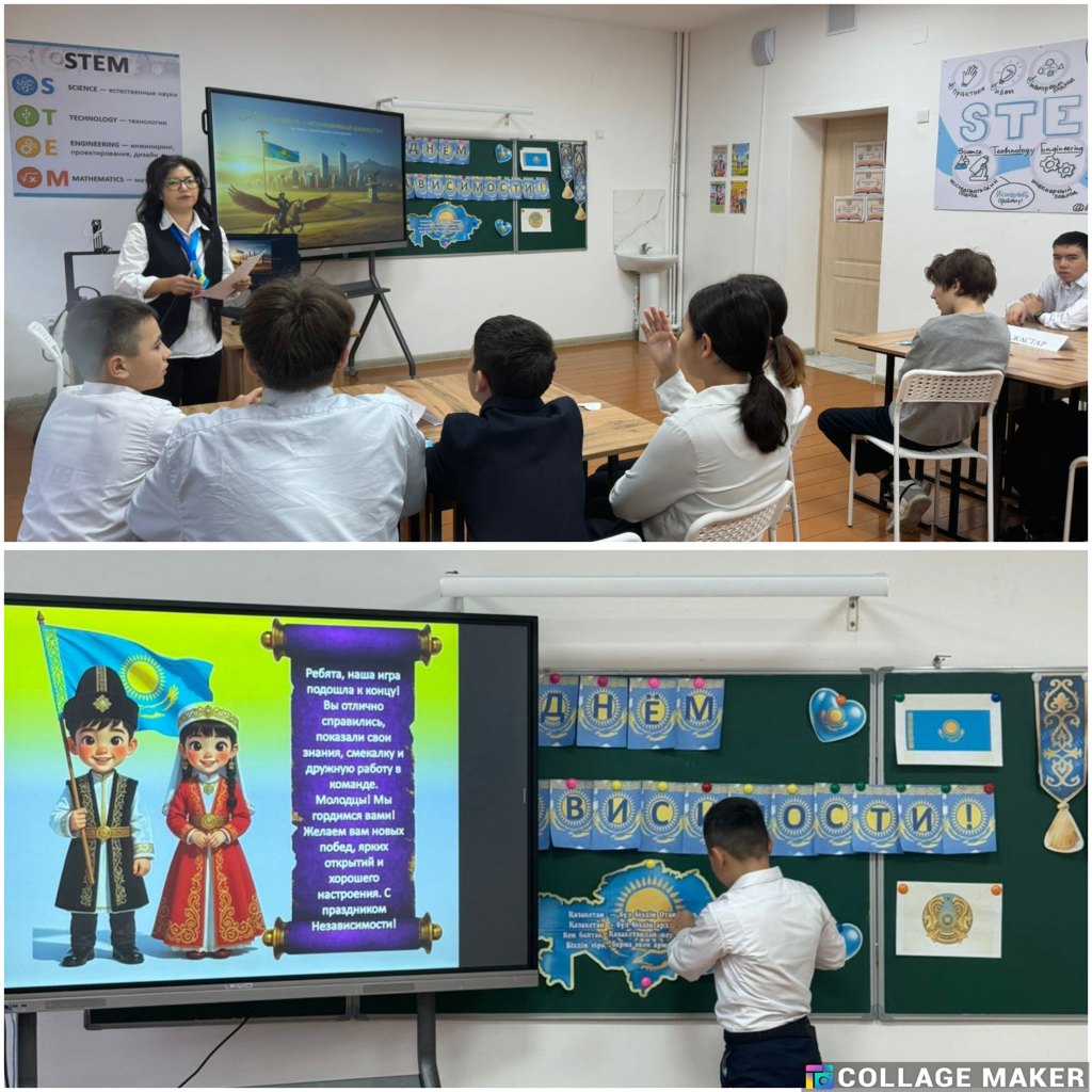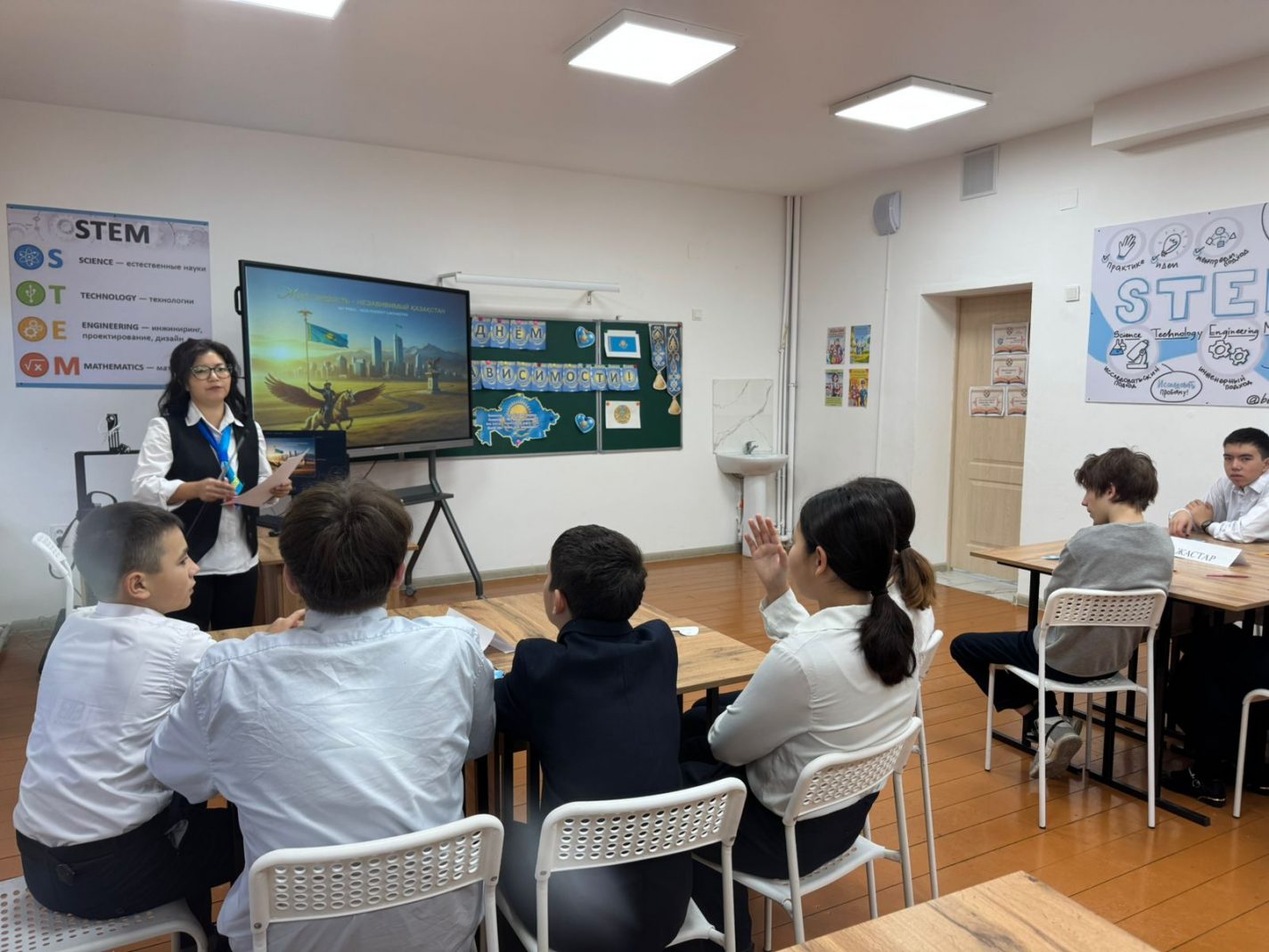 Қазақстан Республикасының Тәуелсіздік күні аясында ағылшын тілі пәні мұғалімі Худжанова Жадра Сабыровна 7 «Б» сынып оқушыларымен «Қазақстан Тәуелсіздігі-мемлекеттің тұрақтылығы өркендеуінің негізі» атты ашық сынып сағатын өткізді. Сабақтың мақсаты – оқушыларға Тәуелсіздіктің тарихи маңызын түсіндіру, елдің қалыптасу жолындағы маңызды кезеңдермен таныстыру, жас ұрпақтың бойында отансүйгіштік сезімін қалыптастыру. Іс‑шара барысында оқушылар Тәуелсіз Қазақстанның жетістіктері, ұлттық құндылықтар, мемлекеттің даму бағыттары туралы өз ойларымен бөлісті. Танымдық бейнематериалдар көрсетіліп, топтық жұмыстар ұйымдастырылды. Сабақ соңында оқушылар еліміздің болашағына жауапкершілікпен қарау, бірлік пен тұрақтылықты сақтау – әр азаматтың парызы екендігін атап өтті.