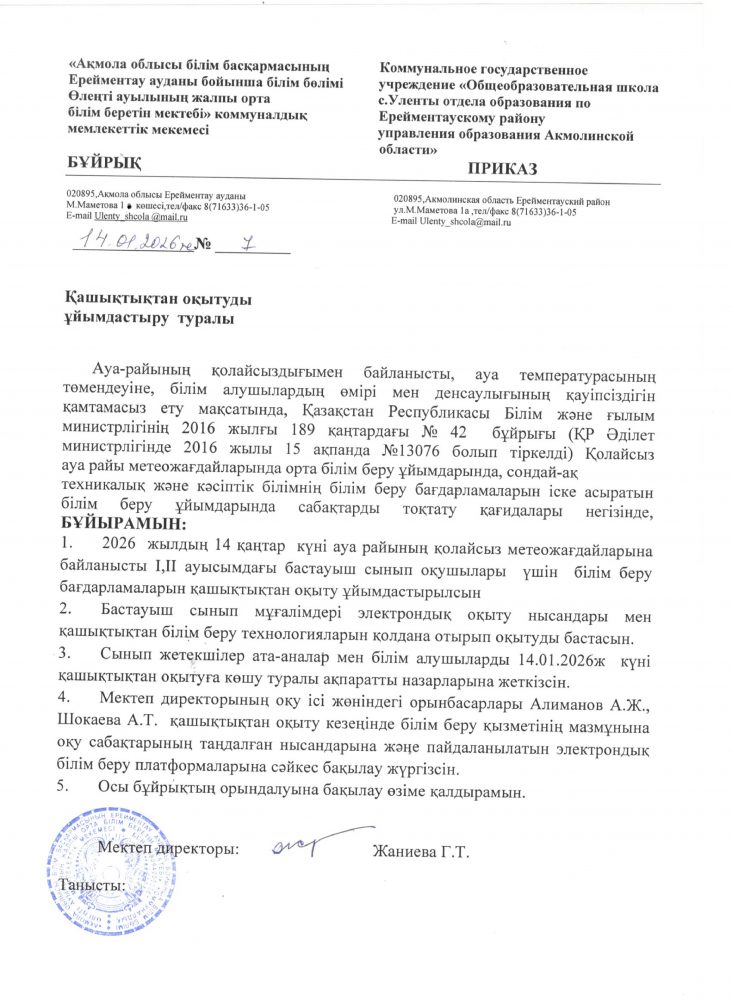 Коммунальное государственное учреждение «Общеобразовательная школа села  Уленты отдела  образования по Ерейментаускому району управления образования Акмолинской области»
