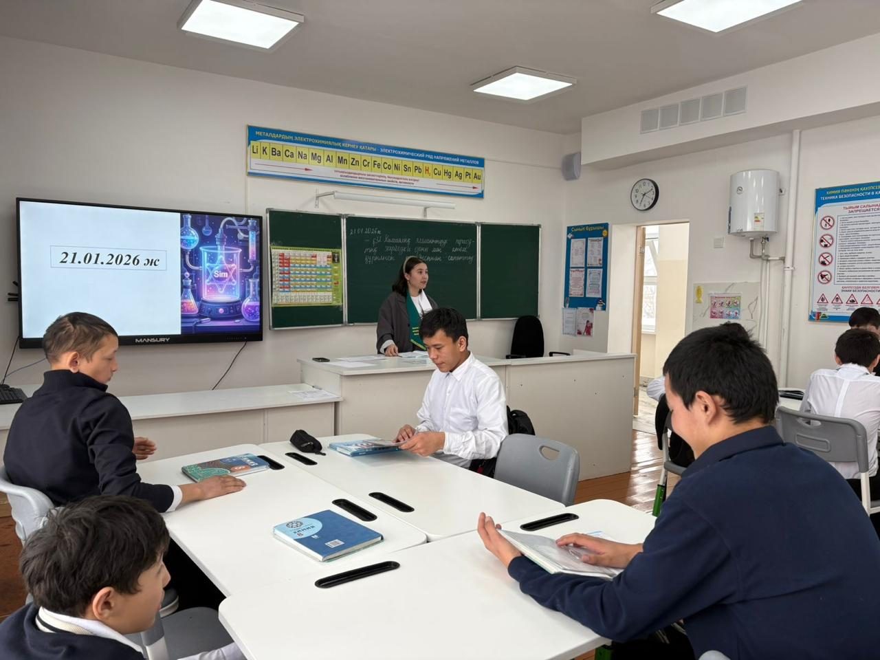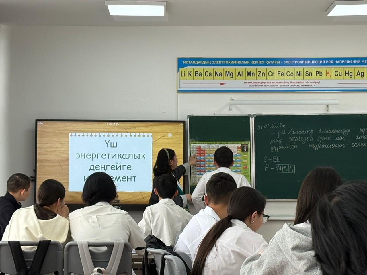 Жаратылыстану-математикалық цикл пәндерінің онкүндік жоспарына сәйкес химия пәні мұғалімі Худайбергенова Маъмура Шакирбековна 8 «А» сыныбында «Химиялық элементтерді периодтық жүйедегі орны мен атом құрылысы тұрғысынан сипаттау » атты ашық сабақ өткізді.