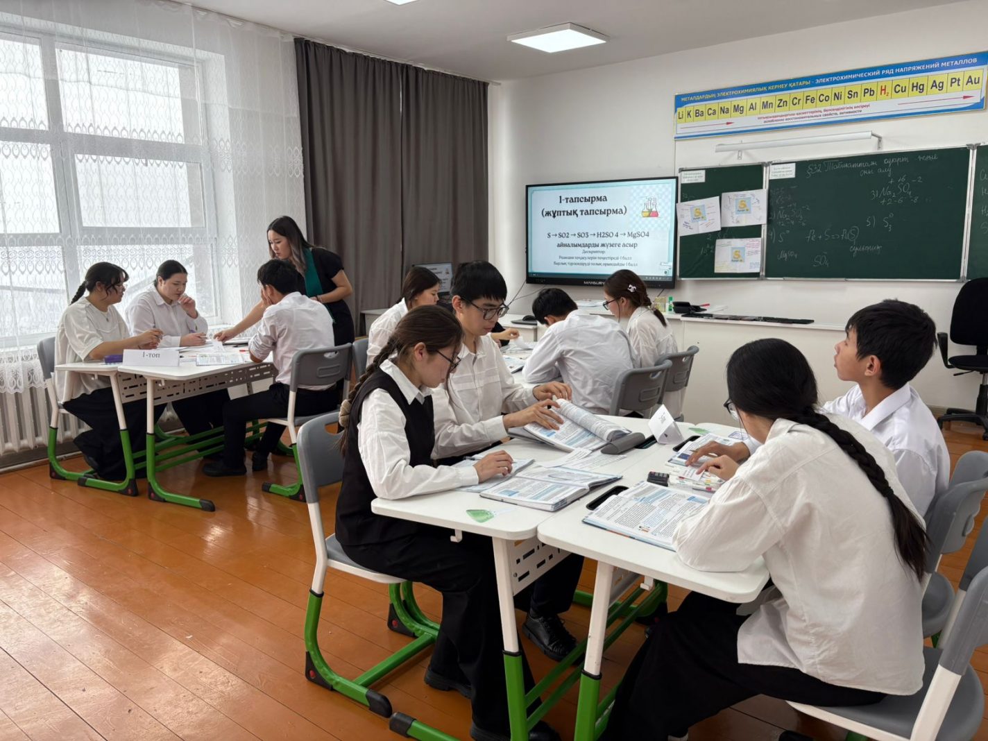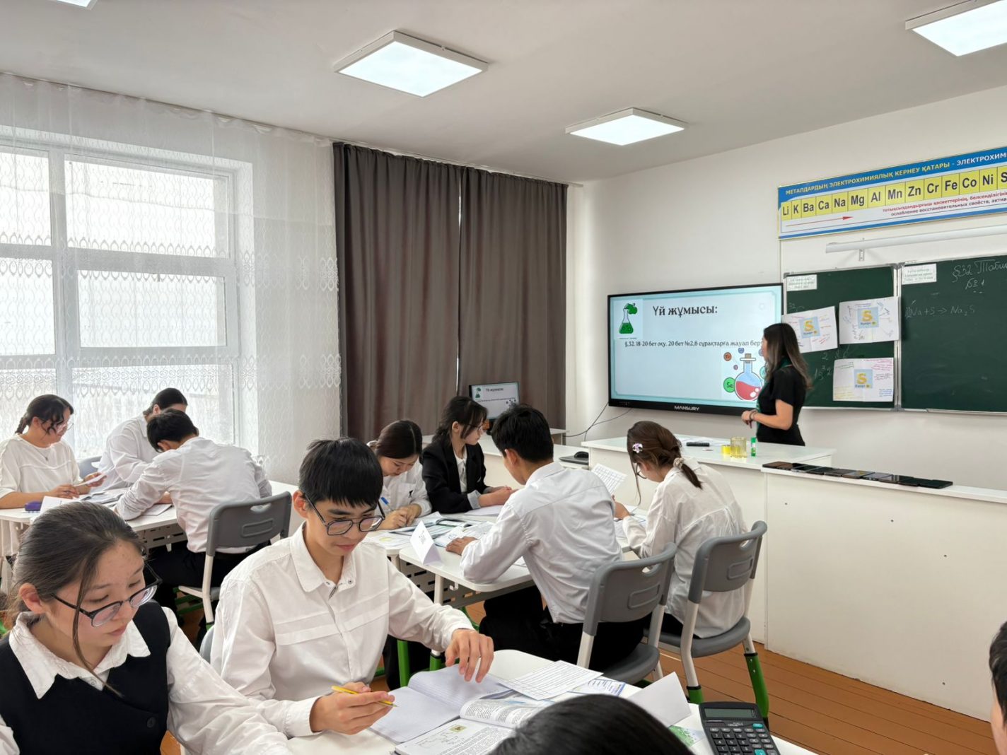 Сабақ барысында мұғалім оқушыларға күкірттің физикалық қасиеттерін таныстырып, күкірттің негізгі химиялық қасиеттерін тәжірибе арқылы көрсете білді.